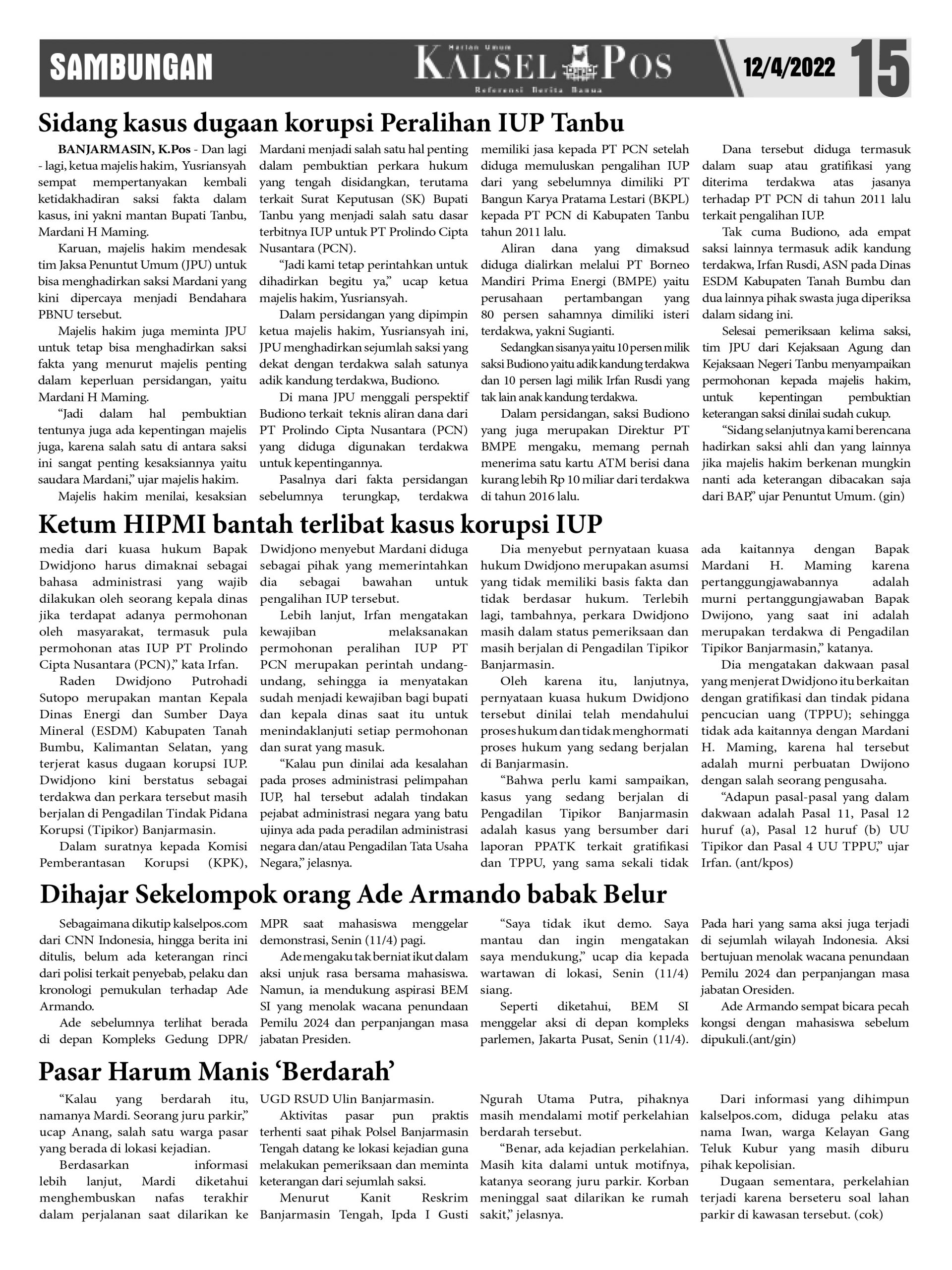 Majelis hakim desak JPU hadirkan mantan Bupati Tanbu. – Epaper Kalselpos 1614 kalselpos12 April 202224 Desember 2025175 views Kalsel Pos Berita Terkini, Kabar Terbaru Hari ini Banjarmasin Kalimantan Selatan dan Nasional Pos terkaitKUHP baru Lebih Untungkan Terdakwa, PN Barabai terapkan di Kasus PenganiayaanSampah Besar kiriman Hulu di Sungai Martapura, Berpotensi ‘hantam’ Jembatan67 ribu warga Terancam tak Terlindungi JKN