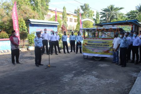 Bantuan yang diberikan, dari Lapas Amuntai berupa gerobak usaha baru serta tambahan modal berupa uang bagi pelaku UMKM di sekitar lingkungan Lapas Amuntai, Kamis (21/4).