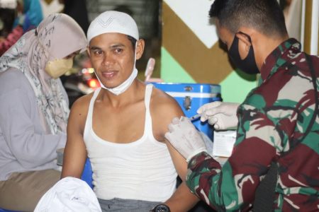 Pelayanan Ini memudahkan warga sekitar Masjid Nurul Ibadah, Desa Loka Bangkai untuk divaksin. Pelayanan diberikan Komando Distrik Militer (Kodim) 1001 Hulu Sungai Utara (HSU) – Balangan yang gencar melakukan vaksinasi Covid-19 di bulan suci Ramadhan, kemarin malam.