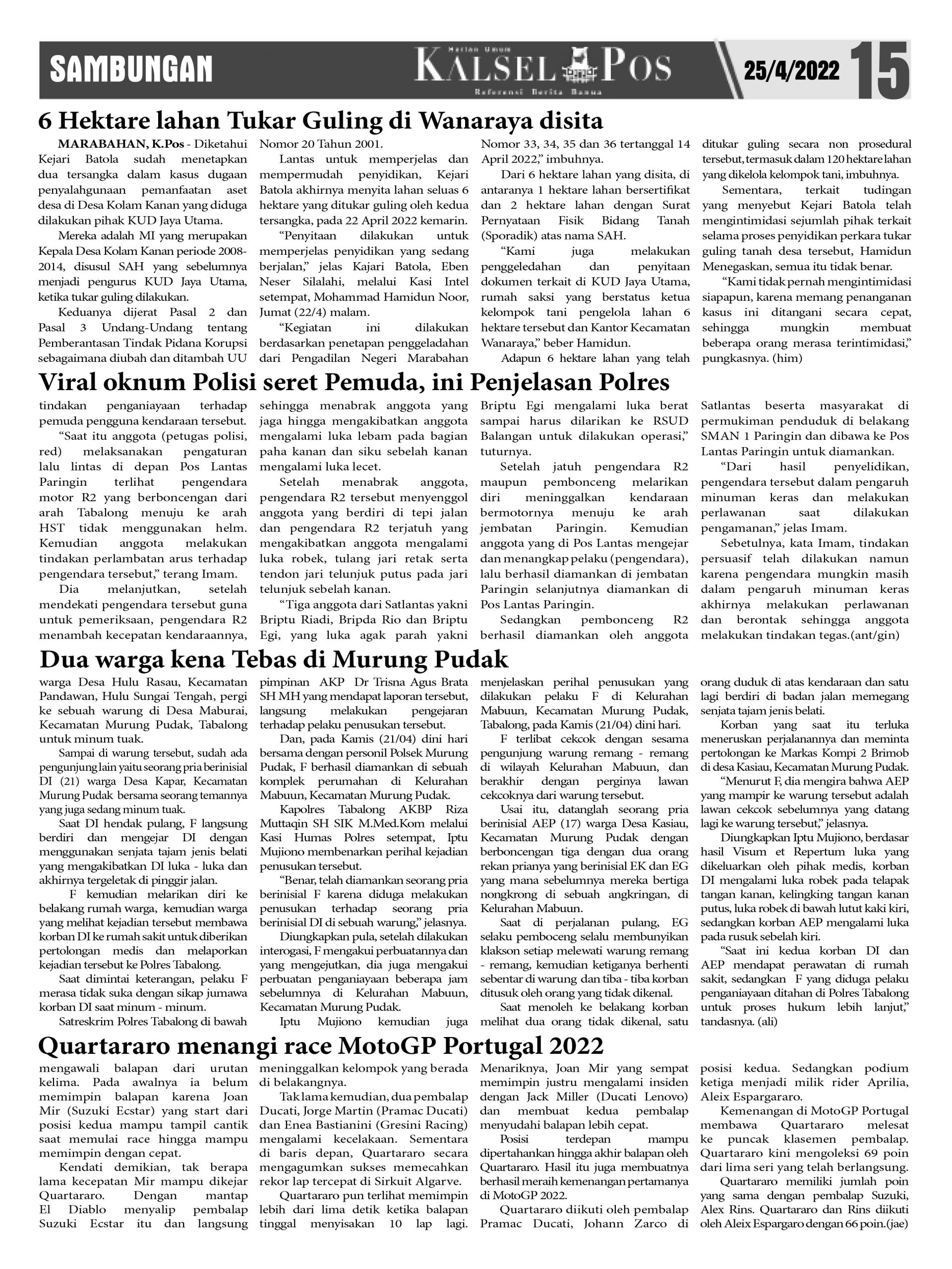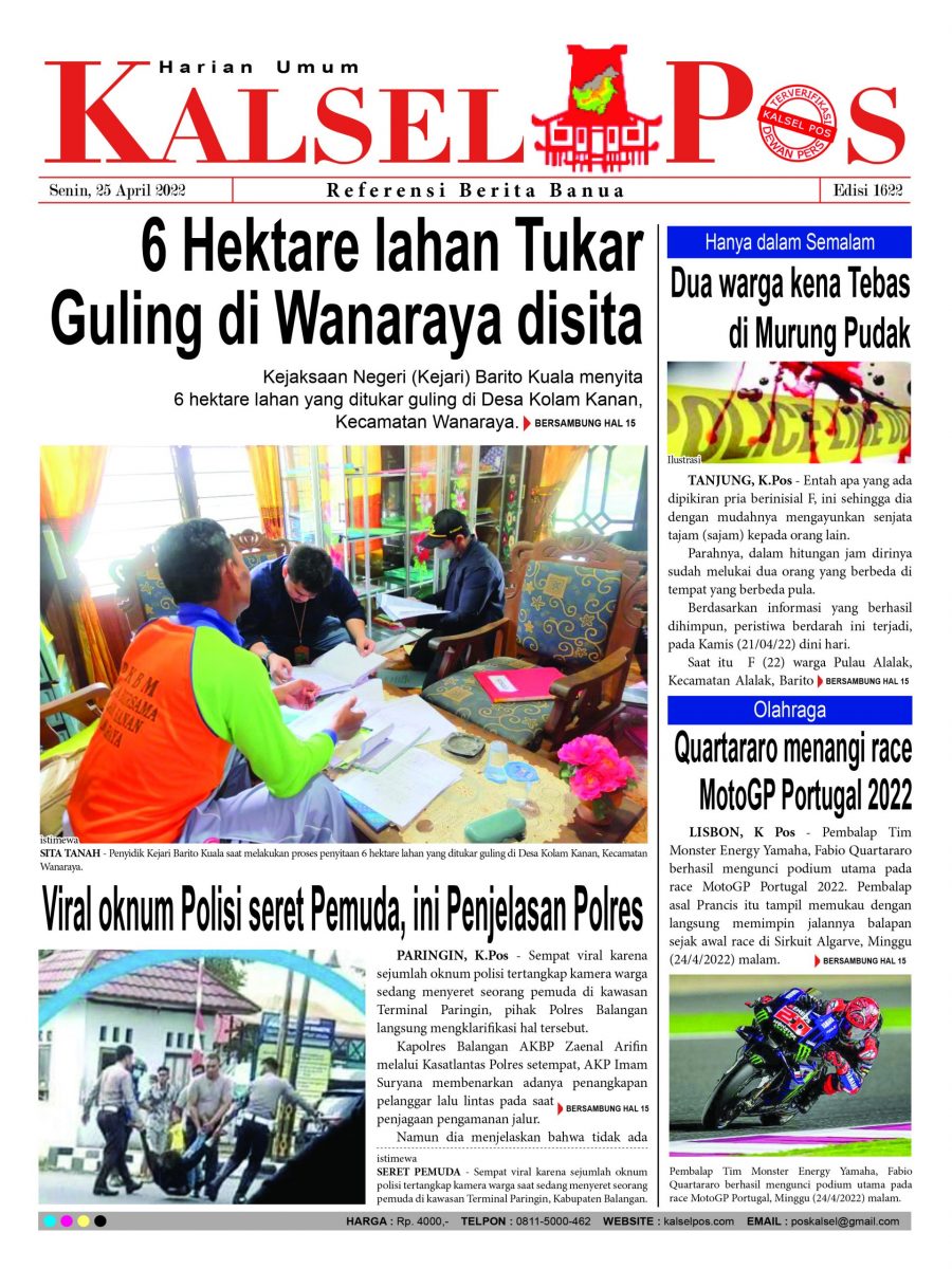 6 Hektare lahan Tukar Guling di Wanaraya disita. Epaper Kalselpos 1622 kalselpos25 April 202224 Desember 2025169 views Kalsel Pos Berita Terkini, Kabar Terbaru Hari ini Banjarmasin Kalimantan Selatan dan Nasional Pos terkaitKUHP baru Lebih Untungkan Terdakwa, PN Barabai terapkan di Kasus PenganiayaanSampah Besar kiriman Hulu di Sungai Martapura, Berpotensi ‘hantam’ Jembatan67 ribu warga Terancam tak Terlindungi JKN