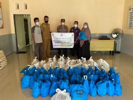Batulicin, kalselpos.com – Polsek Satui, Polres Tanah Bumbu (Tanbu) gelar kegiatan sosial penyaluran bantuan paket bahan pokok (Bapok) makanan bersama relawan AI.