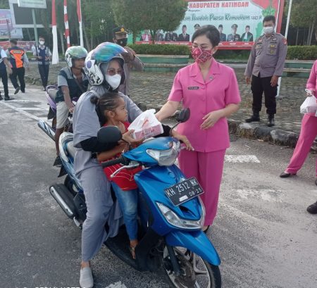 Katingan, kalselpos.com-Ketua cabang Bhayangkari Katingan Ny. Vivi Sonny bersama dengan anggota, membagikan takjil untuk berbuka puasa kepada masyarakat yang melintas di jalan raya.