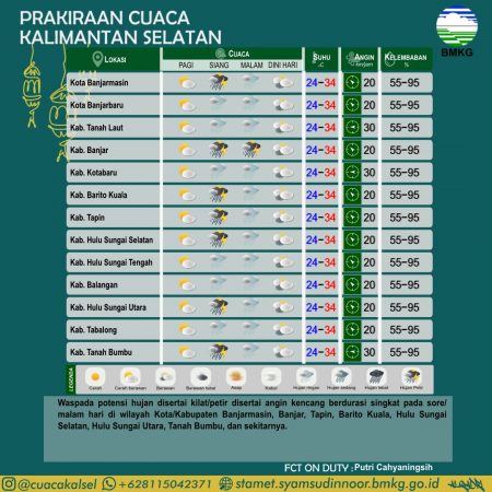 Kemudian potensi hujan lebat disertai kilat atau petir disertai angin kencang pada malam hari di wilayah Banjarmasin, Banjar Baru, Banjar, Barito Kuala, Tapin, Hulu Sungai Selatan (HSS), HST, Hulu Sungai Utara (HSU), Tanah Laut dan sekitarnya.