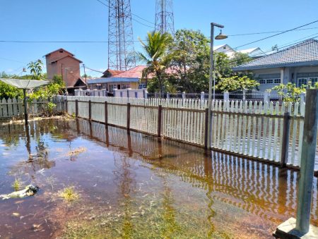 Kasongan,kalselpos.com – Air pasang laut mulai merendam jalan dan halaman permukiman penduduk Kecamatan Katingan Kuala, Senin (23/5 ).