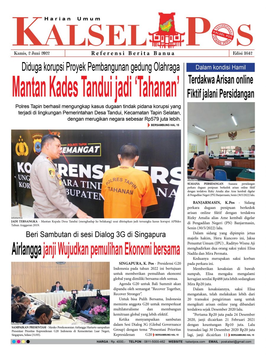 Mantan Kades Tandui jadi Tahanan. Epaper Kalselpos 1641 kalselpos2 Juni 20225 Juni 2022152 views Kalsel Pos Berita Terkini, Kabar Terbaru Hari ini Banjarmasin Kalimantan Selatan dan Nasional Pos terkaitTerkait Korupsi Dana Desa Rp657 juta, Eks Kades di Kusan Hilir divonis 3 TahunDireksi baru PAM Bandarmasih terbentuk, Zulbadi dipercaya jadi DirutParkir Pasar Wadai ‘mencekik’, Pengendara Motor ditagih Rp10 Ribu