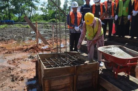Pemancangan tiang pertama ditandai penekanan sirine selanjutnya dilakukan peletakan batu pertama pada pondasi dari Bupati Noormiliyani.