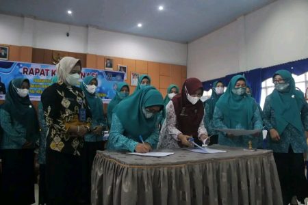 Perjanjian kerjasama penguatan keluarga dalam upaya pencegahan penyalahgunaan narkotika, ditandatangani Ketua Tim Penggerak PKK Kabupaten HSS Isnaniah Achmad Fikry dan Kepala BNNK HSS Agus Winarti, yang disaksikan Wakil Ketua I TP PKK Kabupaten HSS, Srie Astuti Syamsuri Arsyad, saat rapat koordinasi program ketahanan keluarga anti narkoba, Kamis (9/6) di Aula Kecamatan Kandangan.