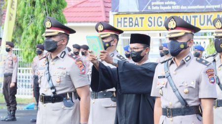 Upacara serah terima dipimpin Kapolres HSU AKBP Afri Darmawan, SIK, MH terhadap jabatan Wakapolres, Kabag Ops, Kapolsek Sungai Pandan, Kapolsek Amuntai Selatan dan Kasat Tahti di lapangan Mapolres HSU, Senin (27/06).
