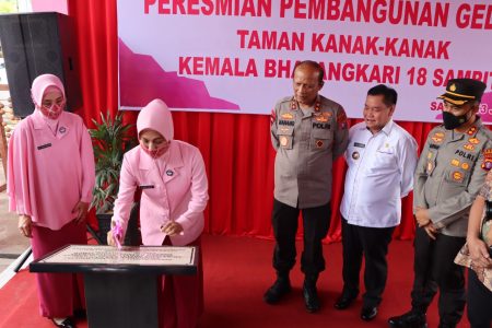 Sampit, kalselpos.com -Bupati Kotawaringin Timur (Kotim) Halikinnoor, mendampingi Kapolda Kalteng Irjen Pol Dr. Nanang Avianto, M.Si bersama Ketua Bhayangkari Daerah Kalteng Ibu Dewi Nanang Avianto meresmikan Gedung TK Taman Bermain (TB) Kemala Bhayangkari 18 di Jalan Yoes Sudarso, Kota Sampit, Kabupaten Kotawaringin Timur (Kotim), Rabu (13/7/2022).