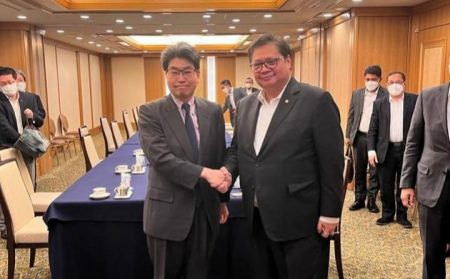 Tokyo, kalselpos.com -Pertemuan Menteri Koordinator Bidang Perekonomian Airlangga Hartarto dengan Gubernur Japan Bank for International Cooperation (JBIC) yang baru Nobumitsu Hayashi digelar di Hotel Imperial Tokyo, Jepang, Senin (25/07).