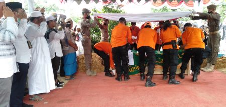 Bupati Balangan H.Abdul Hadi beserta jajaran dan para tokoh masyarakat asal Bumi Sanggam serta warga masyarakat nampak hadir dalam pelaksanaan prosesi pemakaman orang nomor dua di Kabupaten Balangan tersebut.