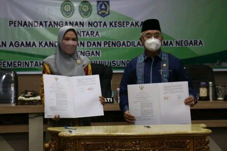 MoU ditandatangani Bupati HSS Achmad Fikri, Ketua PA Kandangan Hikmah, dan Ketua PA Negara Nofia Mutiasari, yang disaksikan Wakil Bupati (Wabup) Syamsuri Arsyad dan Sekda Muhammad Noor.