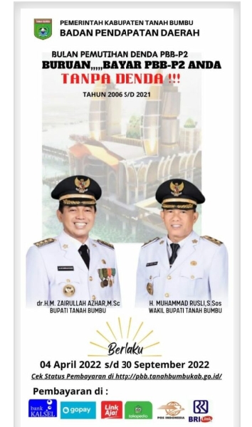 Batulicin,kalselpos.com – Program pemutihan denda Pajak Bumi Bangunan–Perdesaan dan Perkotaan (PBB-P2) di Kabupaten Tanah Bumbu (Kab. Tanbu) Provinsi Kalimantan Selatan berakhir 30 September 2022.
