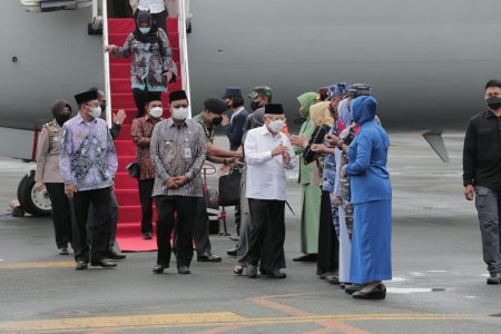 Kedatangan Wapres beserta istri Wury Estu Handayani ini disambut langsung Gubernur Kalsel H. Sahbirin Noor di depan VIP Room Bandara Syamsuddin Noor.