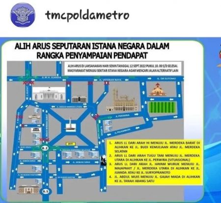 Jakarta, kalselpos.com – Rencananya, hari ini, Senin (12/9/2022), berbagai elemen masyarakat akan melakukan unjuk rasa di kawasan Istana Negar. Adanya demo itu, Direktorat Lalu Lintas Polda Metro Jaya menyiapkan pengalihan arus lalu lintas.