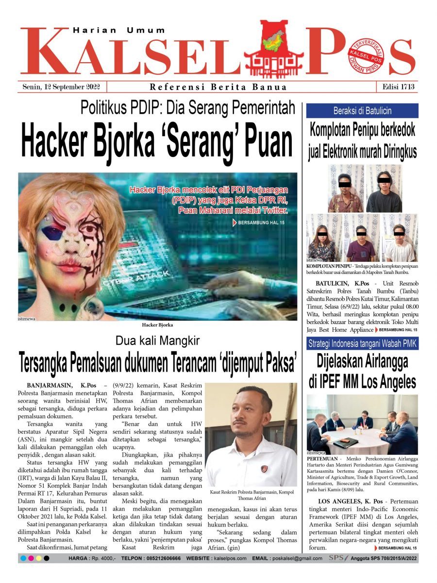 Hacker Bjorka Serang Puan. Epaper Kalselpos 1713 kalselpos12 September 202222 Maret 2025322 views Kalsel Pos Berita Terkini, Kabar Terbaru Hari ini Banjarmasin Kalimantan Selatan dan Nasional Pos terkaitTerkait Korupsi Dana Desa Rp657 juta, Eks Kades di Kusan Hilir divonis 3 TahunDireksi baru PAM Bandarmasih terbentuk, Zulbadi dipercaya jadi DirutParkir Pasar Wadai ‘mencekik’, Pengendara Motor ditagih Rp10 Ribu