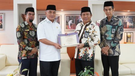 Anugerah tanda mata dan piagam penghargaan tersebut, kemudian diserahkan Kepala Kantor Kemenag Kabupaten HSS Muhammad Yamani kepada Bupati HSS Achmad Fikry, di ruang kerja Bupati, Rabu (14/09).