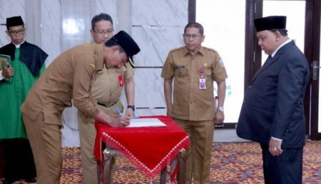 Usai dilantik, dilakukan penandatanganan berita acara sumpah jabatan dari Bupati Banjar kepada Rachman Agus.