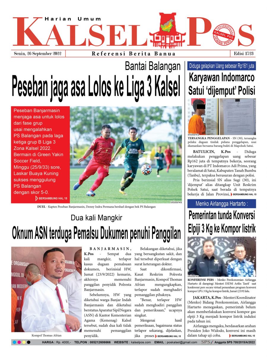 Peseban jaga asa Lolos ke Liga 3 Kalsel. Epaper Kalselpos 1723 kalselpos26 September 202224 Desember 2025132 views Bacaan LainnyaTerkait Korupsi Dana Desa Rp657 juta, Eks Kades di Kusan Hilir divonis 3 TahunDireksi baru PAM Bandarmasih terbentuk, Zulbadi dipercaya jadi DirutParkir Pasar Wadai ‘mencekik’, Pengendara Motor ditagih Rp10 Ribu Kalsel Pos Berita Terkini, Kabar Terbaru Hari ini Banjarmasin Kalimantan Selatan dan Nasional Pos terkaitTerkait Korupsi Dana Desa Rp657 juta, Eks Kades di Kusan Hilir divonis 3 TahunDireksi baru PAM Bandarmasih terbentuk, Zulbadi dipercaya jadi DirutParkir Pasar Wadai ‘mencekik’, Pengendara Motor ditagih Rp10 Ribu