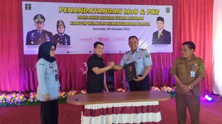 Penandatangan MoU terkait pembentukan hukum, pelayanan hukum, pengembangan budaya hukum, penghormatan, pengajuan dan pemenuhan HAM di Kabupaten HSU yang oleh Ketua DPRD HSU Almien Ashar Safari dengan Kepala Kanwil Kemenkumham Kalsel Lilik Sujandi dan Kepala Divisi Pelayanan Hukum dan HAM bersama Sekwan DPRD HSU.