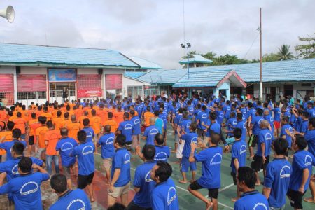 Benar saja, dengan penuh semangat dan energik, petugas dan warga binaan kompak mengikuti gerakan senam yang diperagakan oleh instruktur senam di dalam lapangan blok hunian.