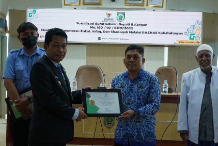 Pada kesempatan ini pula Bupati Balangan H.Abdul Hadi berkenan menyerahkan surat keputusan tentang sosialisasi zakat, infaq dan shadaqah melalui Basnaz Kabupaten Balangan yang diterima perwakilan SKPD dari Dinas Koperasi UMKM Balangan.
