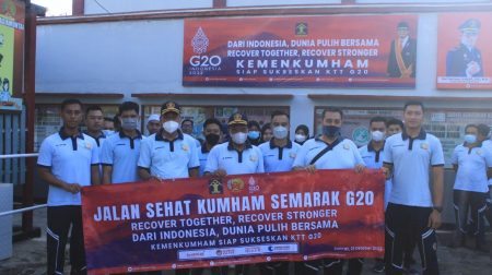 Amuntai,kalselpos.com-Menyemarakkan penyelenggaraan KTT G20 yang digelar di Bali, Petugas Lembaga Pemasyarakatan (Lapas) Kelas IIB Amuntai, Kantor Wilayah kemenkumham Kalimantan Selatan melaksanakan jalan sehat bersama seluruh pegawai, setelah apel pagi, Jumat (12/10).