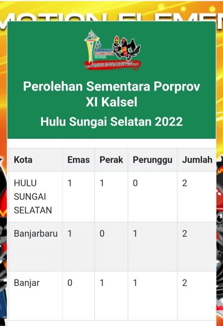 Sedangkan posisi ketiga diduduki kontingan Kabupaten Banjar dengan raihan satu medali perak dan satu medali perunggu.