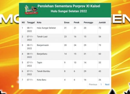 Kandangan, kalselpos.com – Kabupaten Hulu Sungai Selatan (HSS) kembali unggul dari Kabupaten Tanah Laut (Tala) perolehan medali di ajang Pekan Olahraga Provinsi (Porprov) Kalimantan Selatan (Kalsel) 2022, Selasa (8/11) berdasarkan web Resmi KONI HSS, pukul 10.30 WITA.
