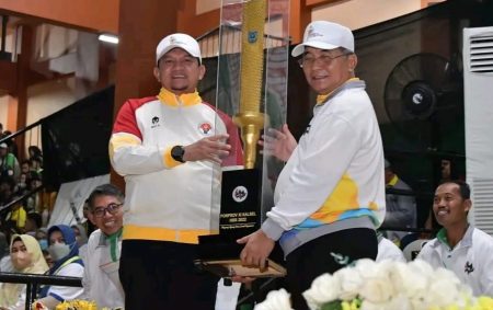 Kandangan, kalselpos.com – Bupati Hulu Sungai Selatan (HSS) Achmad Fikry menyerahkan secara simbolis obor Pekan Olahraga Provinsi (Porprov) XI Kepala Dispora Pemerintah Provinsi (Pemprov) Kalimantan Selatan (Kalsel) Hermansyah, di Closing Ceremony, Minggu (13/12) malam.
