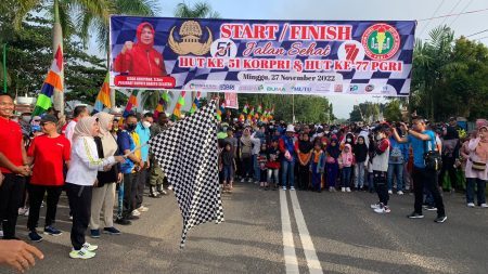 Memeriahkan Hari Guru Nasional (HGN) dan HUT ke-77 PGRI yang jatuh pada tanggal 25 November 2022 serta HUT ke-51 Korpri, Pemerintah Kabupaten Barito Selatan (Barsel) menggelar jalan sehat dan senam bersama di arena ruang Publik Taman Iring Witu pada Minggu pagi 27 November 2022.