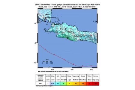 Badan Meteorologi, Klimatologi, dan Geofisika (BMKG) mencatat gempa berkekuatan 6,4 magnitudo yang mengguncang beberapa wilayah di Jawa Barat, berpusat di Kabupaten Garut, Sabtu (3/12/2022).