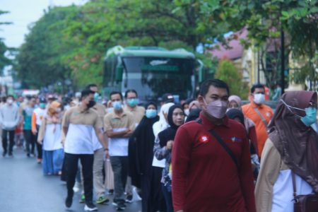 Secara bersama, bahu membahu, dan bergotong royong dalam menghadapi situasi kesehatan di masa pandemi Covid-19, sehingga masyarakat dapat kembali beraktivitas dan produktif agar kembali bangkit dan kembali sehat.
