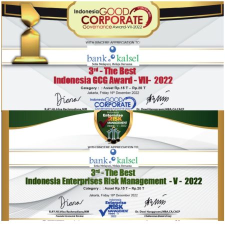 Pada kesempatan ini, Bank Kalsel berhasil memperoleh anugerah penghargaan 3rd The Best GCG Management-VII-2022 (Kategori : Asset Rp.15T – Rp.20T) dan 3rd The Best Indonesia Enteprise Risk Management-V-2022 (Kategori : Asset Rp.15T – Rp.20T).