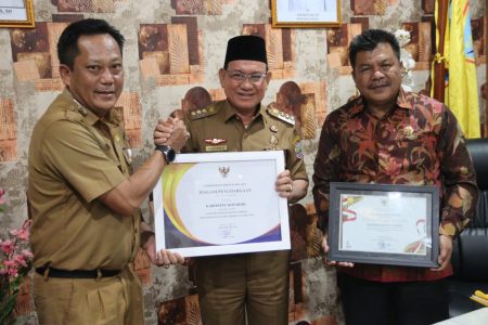 Penyerahan penghargaan ini diserahkan oleh Kepala Dinas Pemberdayaan Masyarakat dan Desa (DPMD) Kotabaru Basuki SH, MH kepada Bupati Kotabaru H Sayed Jafar di Ruang Kerjanya, Senin (9/1) siang.