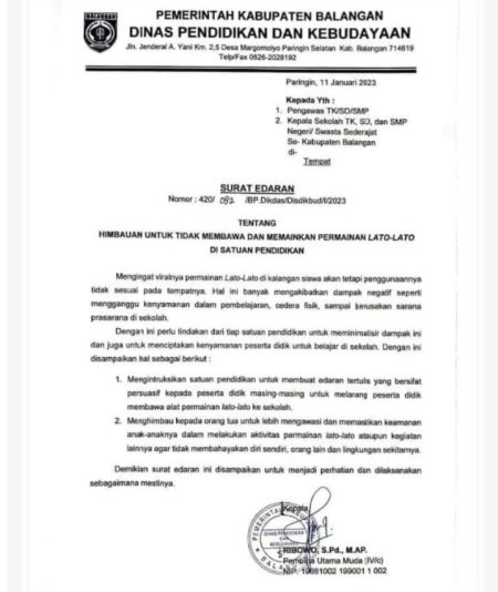 Paringin, kalselpos.com– Menyikapi mewabahnya permainan lato-lato di banua beberapa waktu terakhir, Dinas Pendidikan Kabupaten Balangan mengeluarkan Surat Edaran.