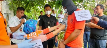 Kotabaru, kalselpos.com– Sebanyak 27 reka adegan yang diperagakan oleh Hadrianor alias Andut (30), tersangka pelaku dugaan pembunuhan seorang janda muda, berinisial WP (34), warga Desa Semayap, Kecamatan Pulau Laut Utara, yang dilakukan di GOR Bamega Kotabaru, Sabtu (14/1/23) lalu.