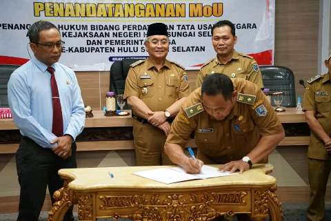 Kandangan, kalselpos.com – Pemerintah Desa se-Kabupaten Hulu Sungai Selatan (HSS) Memorandum of Understanding (MoU) penanganan hukum bidang perdata dan tata usaha negara, Selasa (14/2).