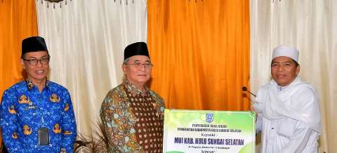 Bantuan dana hibah tersebut diserahkan langsung oleh Bupati HSS Achmad Fikry kepada Ketua MUI Kabupaten HSS Jamhari Muhdin dan Ketua DMI Kabupaten HSS H Muhammad Thaha yang didampingi Sekda Muhammad Noor.