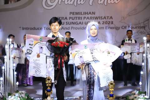 Keluar sebagai juara yang dinobatkan menjadi Putra Putri Pariwisata HSU 2023 ialah, Muhammad Naufa dan Aidha Elma Syarifah, usai menyisihkan enam pasangan finalis lainnya, Sabtu (18/02) malam.