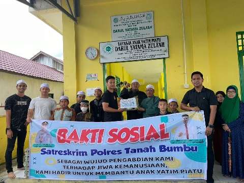 Jajaran Sat Reskrim, Polres Tanah Bumbu (Tanbu), Polda Kalsel, menggelar bakti sosial dengan memberikan bantuan bahan pokok makanan kepada Yayasan Darul Yatama Zulfah di Jalan 5 Oktober, Kecamatan Simpang Empat, Sabtu (4/3).