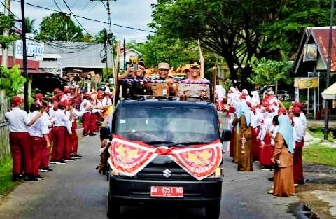 Bersama Forkopimda, para Camat, pasukan kuning dan sejumlah pelajar, Pj Bupati Batola Mujiyat, S. Sn, M.Pd lakukan parade kirab Adipura keliling Kota Marabahan, Senin (6/3/2023). ini