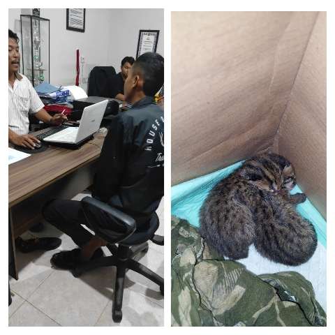 Disebutkan, dua ekor Kucing Hutan tadi dibawa oleh MR, dengan memasukan atau menyimpannya dalam kardus mie, beralaskan kain bekas warna hijau kombinasi gambar daun.