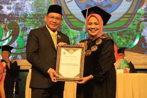 Penganugerahan ini diserahkan langsung oleh Rektor Unitomo Dr Siti Marwiyah dan disaksikan seluruh yang hadir pada saat wisuda semester gasal Universitas DR Soetomo tahun akademik 2022/2023.