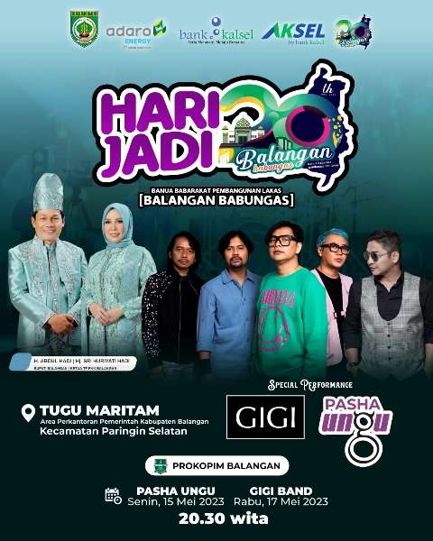 Paringin,kalselpos.com – Rangkaian perayaaan Hari Jadi Kabupaten Balangan yang ke 20 bakal dimeriahkan artis ibukota yakni Pasha Ungu dan Gigi Band.