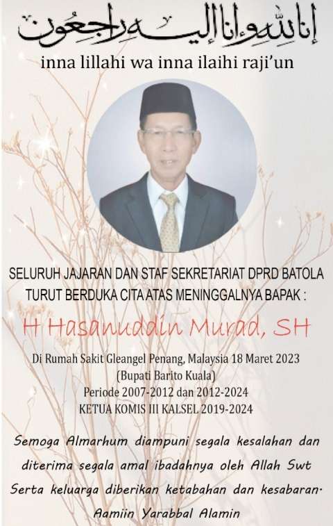 Kami turut berduka cita atas Meninggalnya H. Hasanuddin Murad SH, mantan Bupati Batola Periode 2007–2012 dan 2012-2017 dan anggota DPRD Kalsel masa bakti 2019-2024.