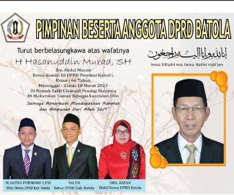 Turut berduka cita atas Meninggalnya H. Hasanuddin Murad SH, mantan Bupati Batola Periode 2007–2012 dan 2012-2017 dan anggota DPRD Kalsel masa bakti 2019-2024.