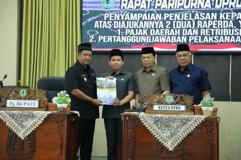 Amuntai, kalselpos.com – Dua buah Rancangan Peraturan Daerah (Raperda) disampaikan Penjabat (Pj) Bupati Hulu Sungai Utara (HSU) Raden Suria Fadliansyah ke Dewan Perwakilan Rakyat Daerah (DPRD) HSU.