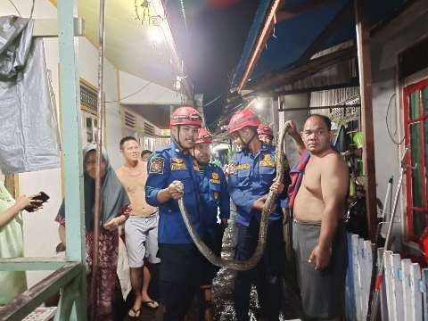 Banjarmasin, kalselpos.com-Seekor ular piton yang memasuki perumahan warga membuat keresahan,petugas Damkar pun sempat dibuat kewalahan karena ular yang akan ditangkap bersembunyi dibalik dinding rumah.