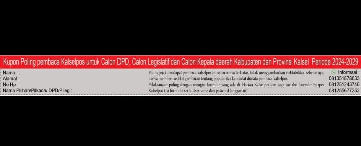 Pelaksanaan Poling dengan mengisi formulir yang ada di Harian Kalsel Pos, juga bisa melalui formulir yang ada di Epaper kalselpos.com melalui pesan WatsApp, dengan menulis username serta pasword langganan.